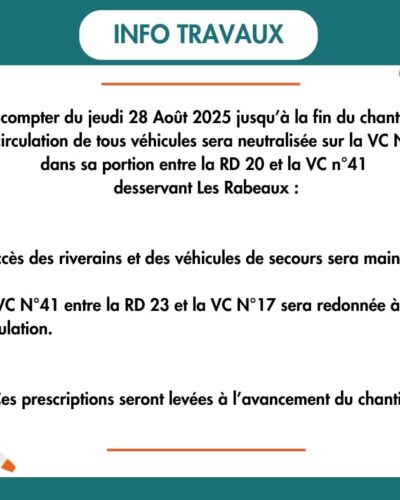 A compter du lundi 20 octobre 2025 jusqu’à la fin des travaux, la circulation de tous véhicules sera neutralisée ponctuellement Route de la...
