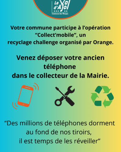 Des missions de téléphones dorment au fond de nos tiroirs... il est temps de les réveiller !Venez déposer votre ancien téléphone portable en Mairie !Déjà 8 millions d’anciens téléphones ont...
