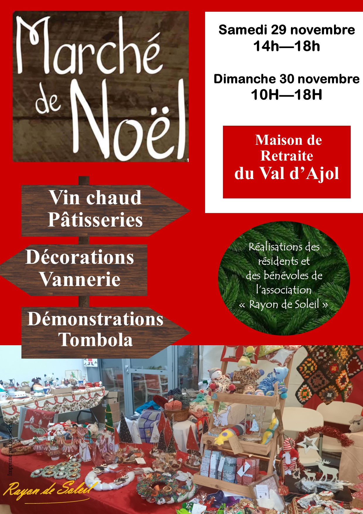 L’association “Rayon de Soleil” a le plaisir de vous convier au marché de Noël qu’elle organise les samedi 29 novembre (14h-18h) et dimanche 30 novembre 2025 (10h-18h) au sein de la Résidence du Val de Joye.