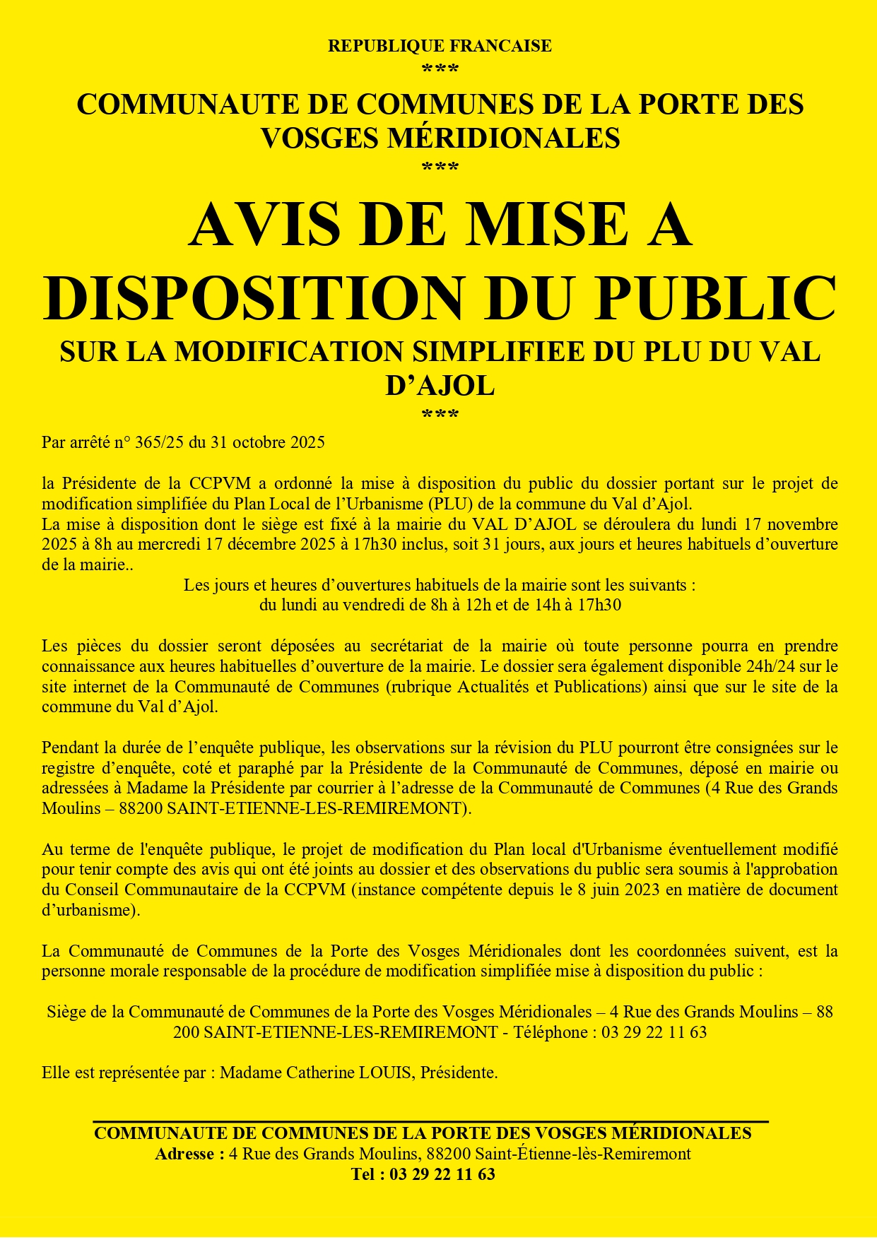 La mise à disposition dont le siège est fixé à la mairie du VAL D’AJOL se déroulera du lundi 17 novembre 2025 à 8h au mercredi 17 décembre 2025 à 17h30 inclus, soit 31 jours, aux jours et heures habituels d’ouverture de la mairie..