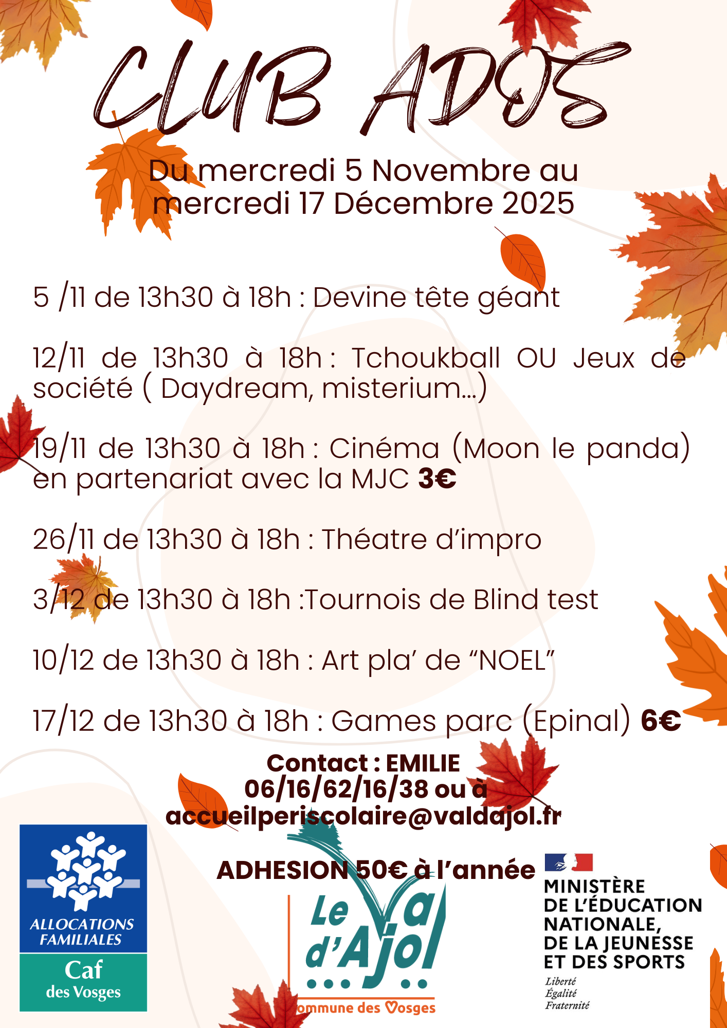 Contact ÉMILIE 06/16/62/16/38 ou acceuilperiscolaire@valdajol.fr
