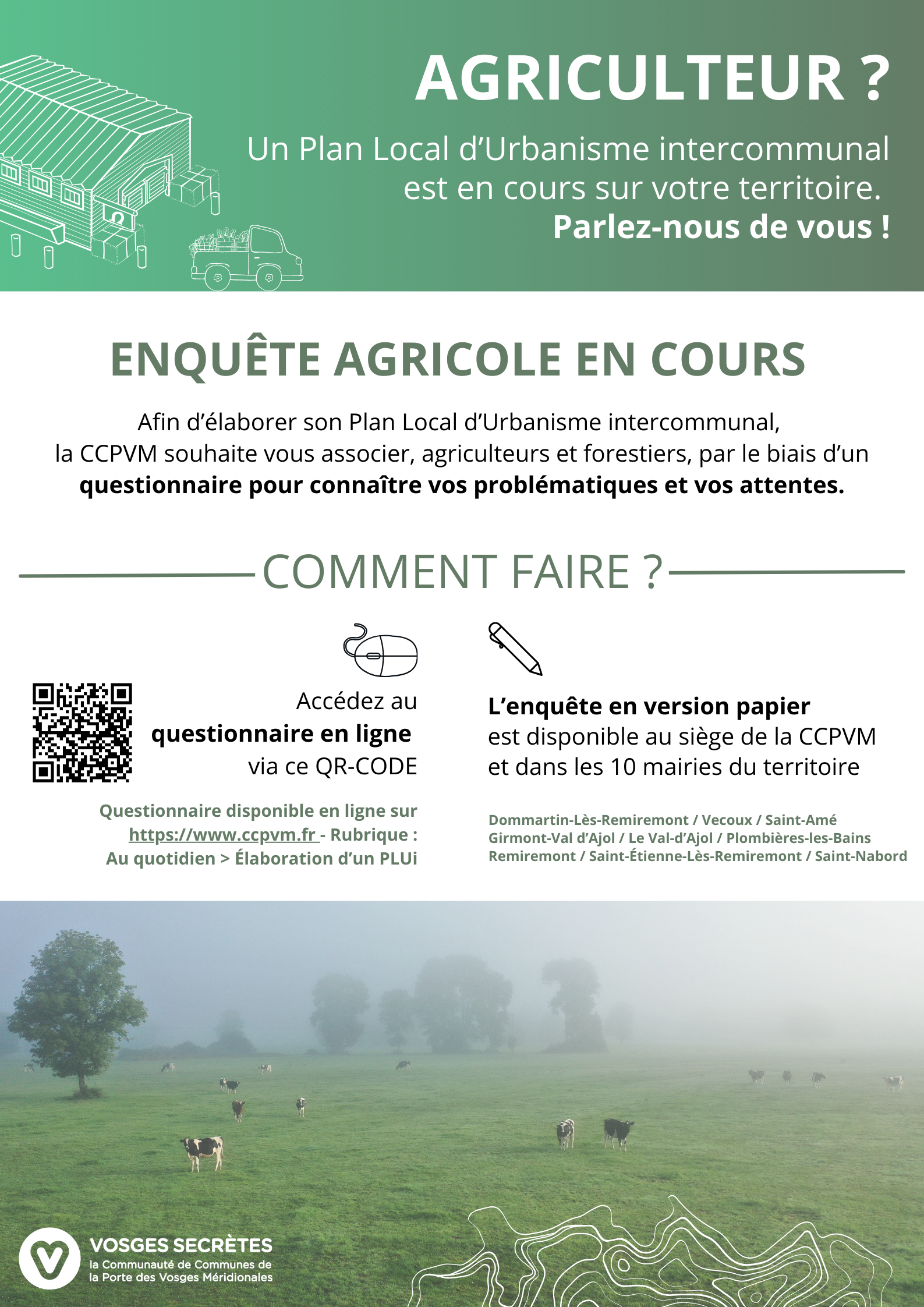 > soit via un formulaire pdf de l’enquête à télécharger > sur le site internet de la CCPVM : https://www.ccpvm.fr/wp-content/files/2025/03/Questionnaire_agricole_CCPVM-VF.pdf
